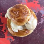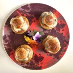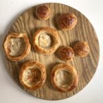 But culinary fashions evolve and these days bouchées are seen less often, so I decided to try my hand at home. Making the shells is like playing with Play-Doh. You cut out large rounds of pastry, rings of the same size and smaller rounds for the caps. You top the large rounds with the rings and set the small rounds beside them, coat everything with an egg wash and pop them into the oven. You then make the filling and assemble the pastries.