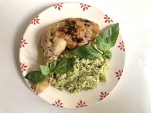 Roast chicken with thyme marries well with practically anything. Serve with the veggies of your choice, with rice, pasta or lentils, with a salad, fresh tomatoes, whatever.