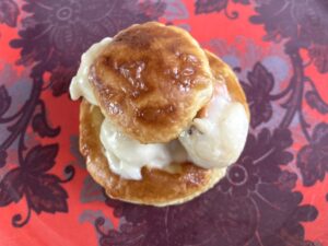 Gather your pastry shells and their caps on a board or large plate. Spoon in the filling. Top with the caps.