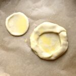 Place the rings on top of the large rounds on the baking sheet. Press down lightly so that they stick. Place the small rounds on the baking sheet separately. Coat with the egg wash.