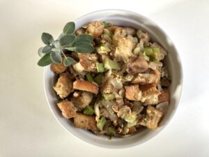 This is a classic bread and chestnut stuffing with a French twist thanks to the addition of fresh sage and herbes de Provence, a mixture of dried rosemary, thyme, savory, oregano and sometimes basil. The fresh sage imparts a musky flavor that deepens as the herb is sautéed in butter with the other ingredients. Once you’ve tried it, you’ll never look back.