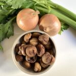 While the bread is toasting, peel and chop the onions. Chop up the celery. Drain the chestnuts if necessary.